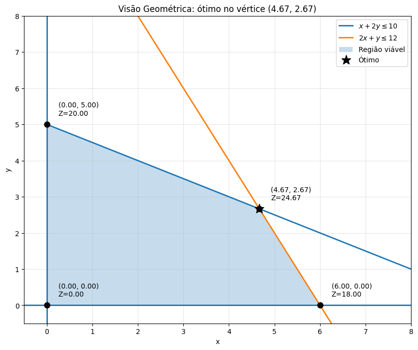 # prog linear interpretação geometricaimport numpy as npimport matplotlib.pyplot as plt# grade para xx = np.linspace(0, 8, 400)# restrições (em forma y = ...)y1 = (10 - x) / 2 # x + 2y = 10 -> y = (10 - x)/2y2 = 12 - 2*x # 2x + y = 12 -> y = 12 - 2xplt.figure(figsize=(10, 8))# linhas das restriçõesplt.plot(x, y1, label=r'$x + 2y \leq 10$', linewidth=2)plt.plot(x, y2, label=r'$2x + y \leq 12$', linewidth=2)# não-negatividade (eixos)plt.axvline(0, linewidth=2) # x = 0plt.axhline(0, linewidth=2) # y = 0# região viável: abaixo das duas retas e acima de y=0y_feasible = np.minimum(y1, y2)y_feasible = np.maximum(y_feasible, 0)plt.fill_between(x, 0, y_feasible, alpha=0.25, label='Região viável')# vértices (calculados/confirmados)# Interseção das retas:# x + 2y = 10# 2x + y = 12 -> solução: x=14/3, y=8/3vertices = [ (0, 0), (0, 5), # quando x=0 na 1ª restrição: 2y=10 -> y=5 (e satisfaz a 2ª) (14/3, 8/3), # interseção (6, 0) # quando y=0 na 2ª restrição: 2x=12 -> x=6 (e satisfaz a 1ª)]# função objetivo (max)def Z(x, y): return 3*x + 4*y# plotar vértices e anotar valor da função objetivofor (vx, vy) in vertices: plt.plot(vx, vy, 'ko', markersize=8) plt.annotate( f'({vx:.2f}, {vy:.2f})\nZ={Z(vx, vy):.2f}', xy=(vx, vy), xytext=(vx + 0.25, vy + 0.25) )# destacar o ótimobest = max(vertices, key=lambda p: Z(p[0], p[1]))plt.plot(best[0], best[1], 'k*', markersize=14, label='Ótimo')plt.xlim(-0.5, 8)plt.ylim(-0.5, 8)plt.xlabel('x')plt.ylabel('y')plt.grid(alpha=0.3)plt.legend()plt.title(f'Visão Geométrica: ótimo no vértice ({best[0]:.2f}, {best[1]:.2f})')plt.show()print("Vértice ótimo:", best, "com Z =", Z(best[0], best[1]))