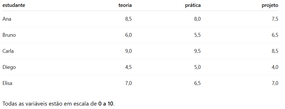 Exemplo, conforme a tabela abaixo, que já estão na mesma escala de 0 a 10, ou seja, não precisa normalizar.