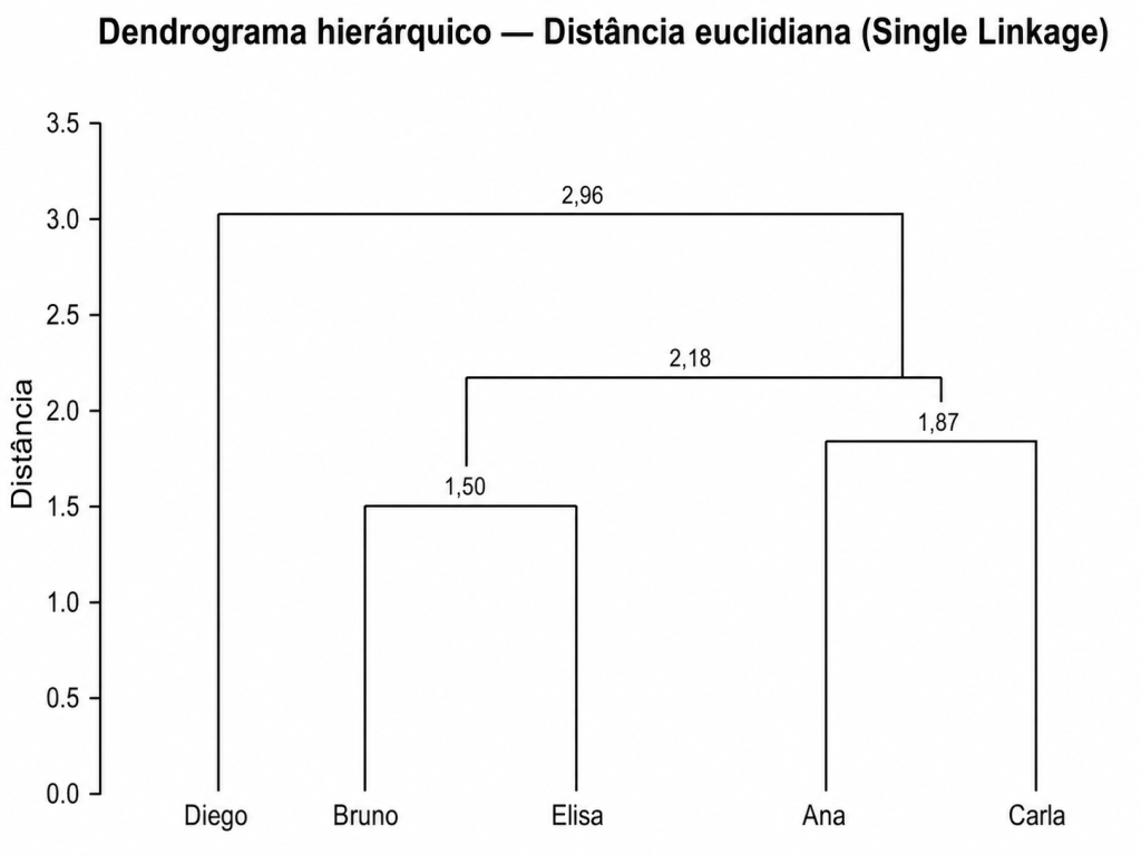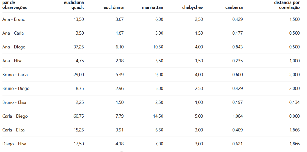 Exemplo: Para calcular a distância, normalmente utiliza-se uma das medidas: euclidiana, euclidiana quadrática ou distância de Manhattan, distância de Chebychev, distância de Canberra (proporção), ou até a correlação de Pearson entre as observações.