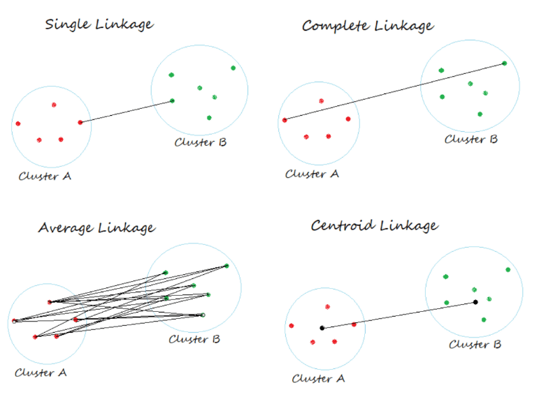 Ligação Média (Average Linkage): Calcula a distância entre dois clusters como a média das distâncias entre todos os pares de pontos (um de cada cluster).
