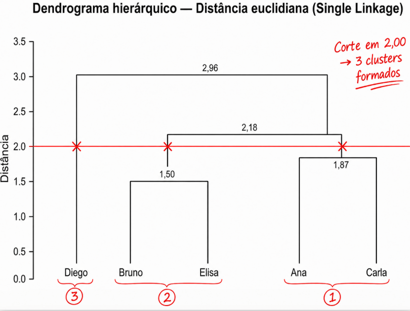 Ligação Simples (Single Linkage)/(vizinho mais próximo): Define a distância entre dois clusters como a menor distância entre qualquer ponto do primeiro cluster e qualquer ponto do segundo cluster.